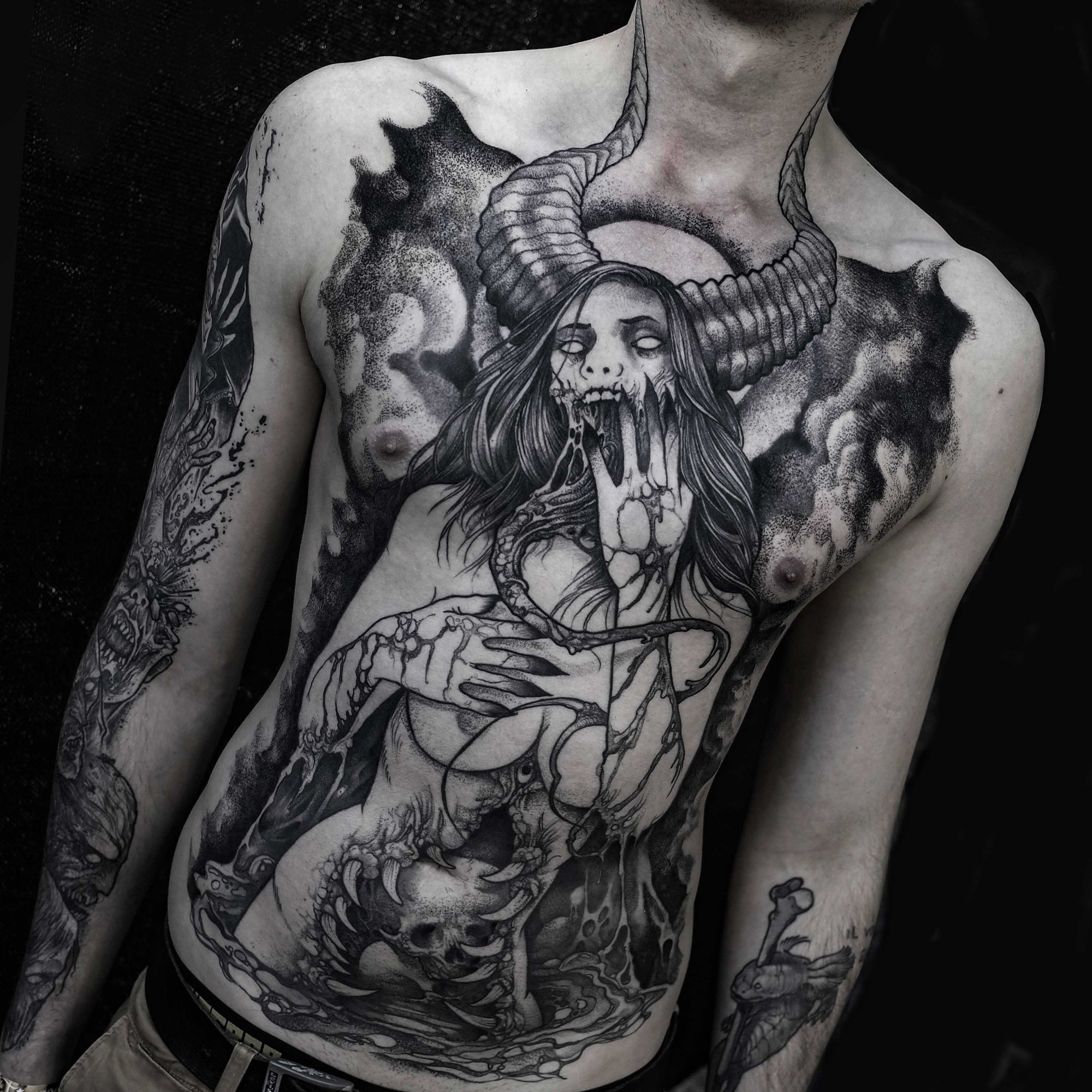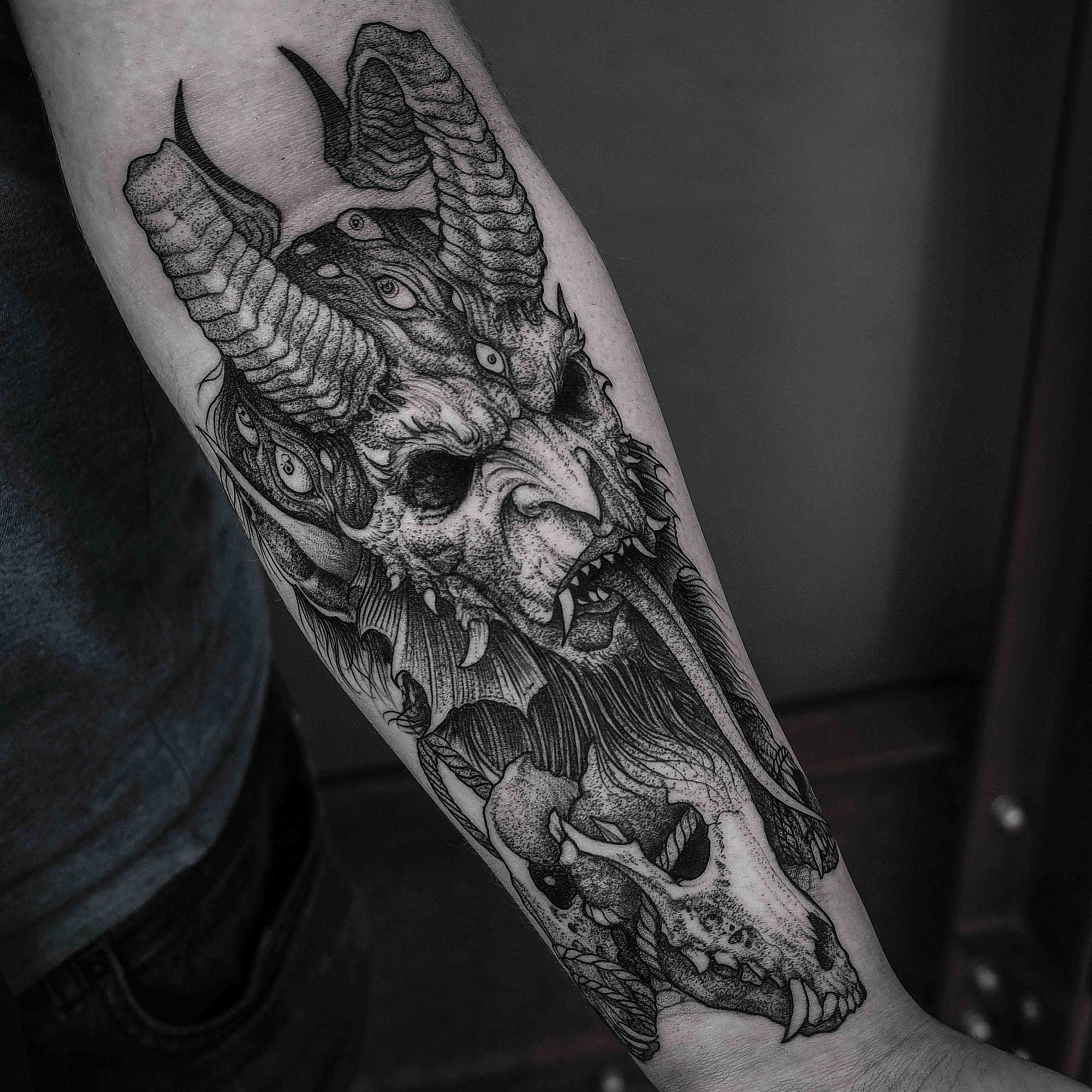 Los diseños tienen mucho negro pleno y algunos tonos de grises, pero la oscuridad pasa más por las temáticas elegidas que por cuestiones pictóricas (en sus comienzos hizo muchos tattoos con color y recientemente lo ha vuelto a incorporar). “La ilustración también está presente porque mi enfoque es cercano a elementos del tatuaje clásico, como el Realismo”.