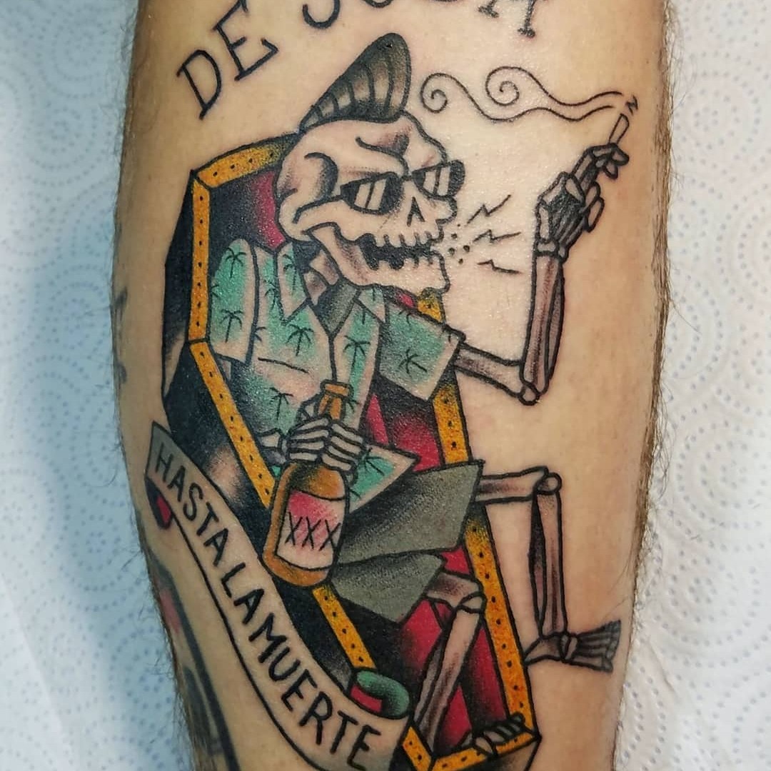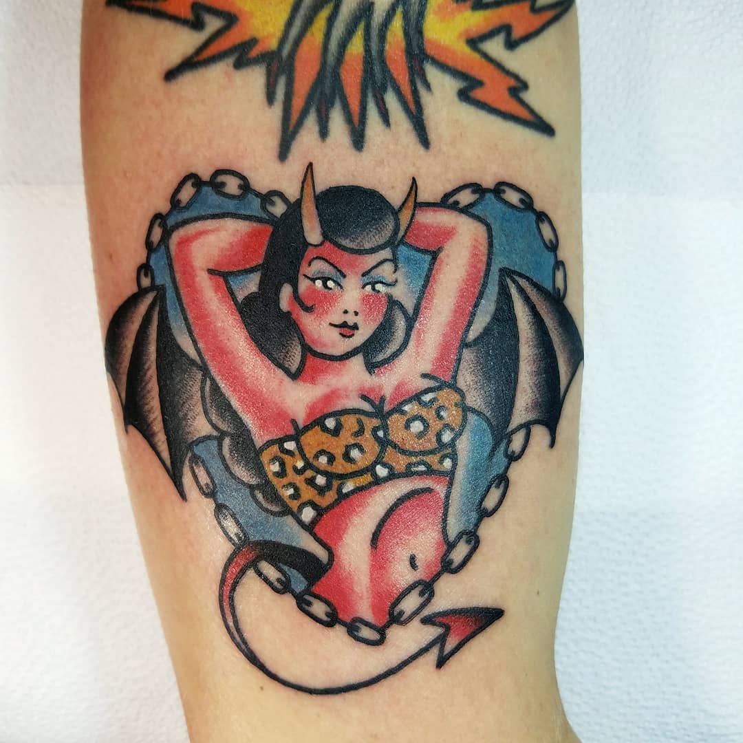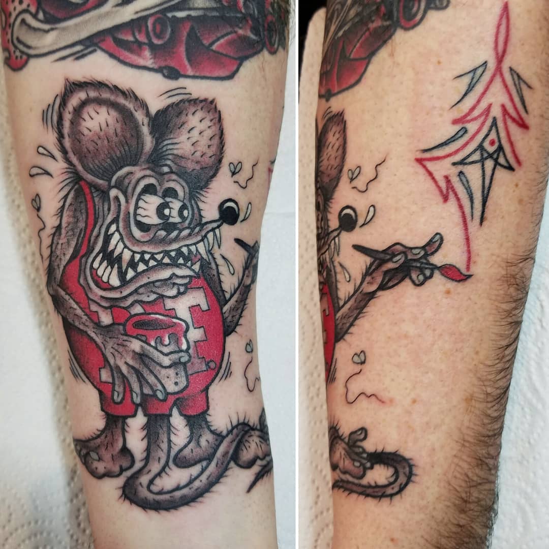 Sus influencias por fuera del tatuaje abarcan los comics y la ilustración relacionados con los dibujos animados y la música, en particular el género del rockabilly. “Desde que empecé a tatuar sentí que todo eso se podía fusionar con las bases del Tradicional Americano. Así que tomé ese rumbo”.