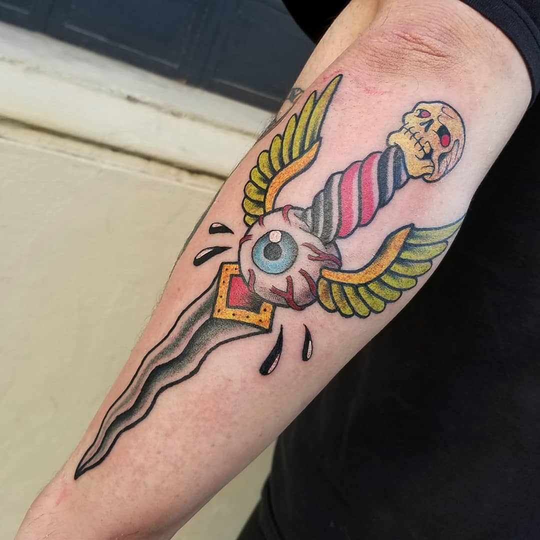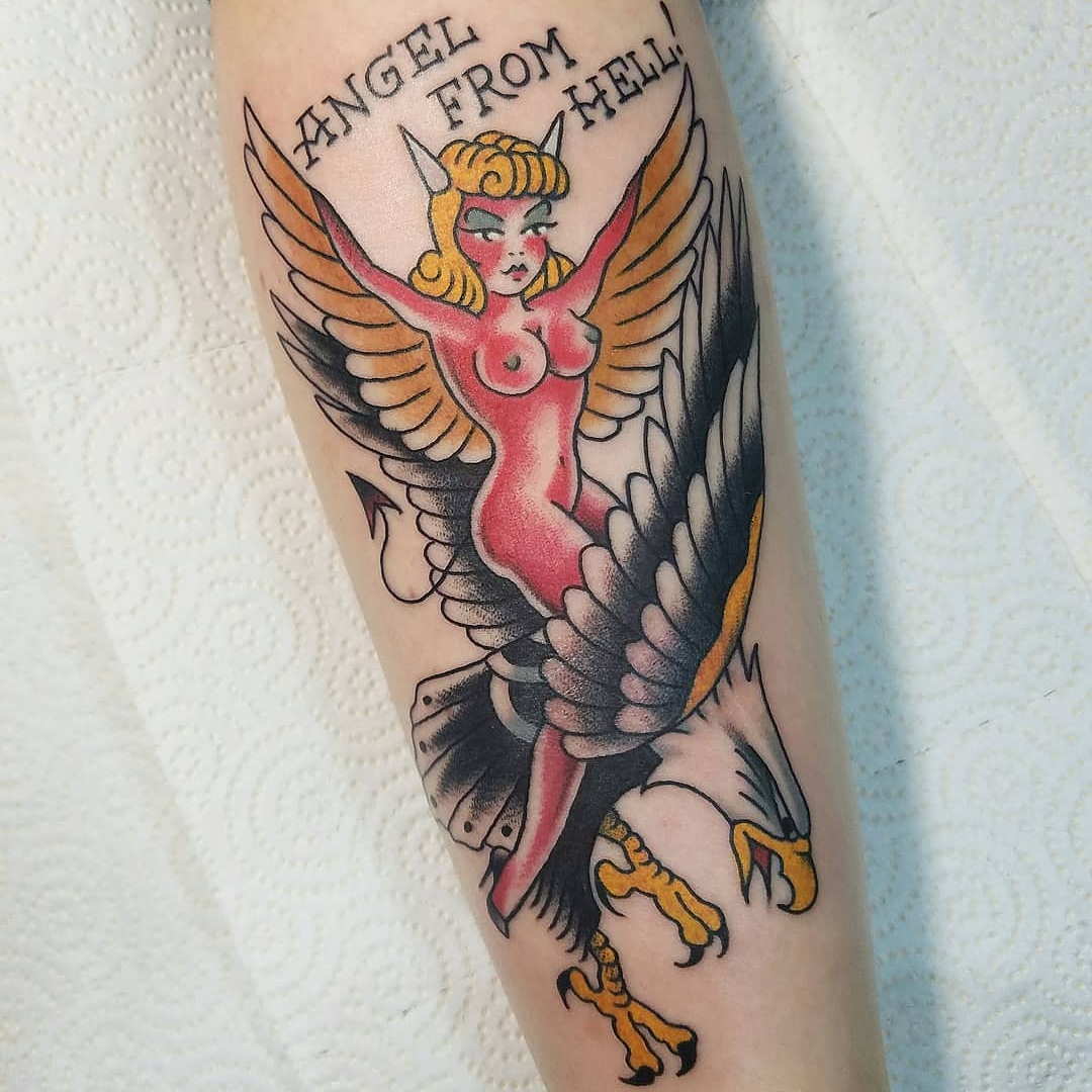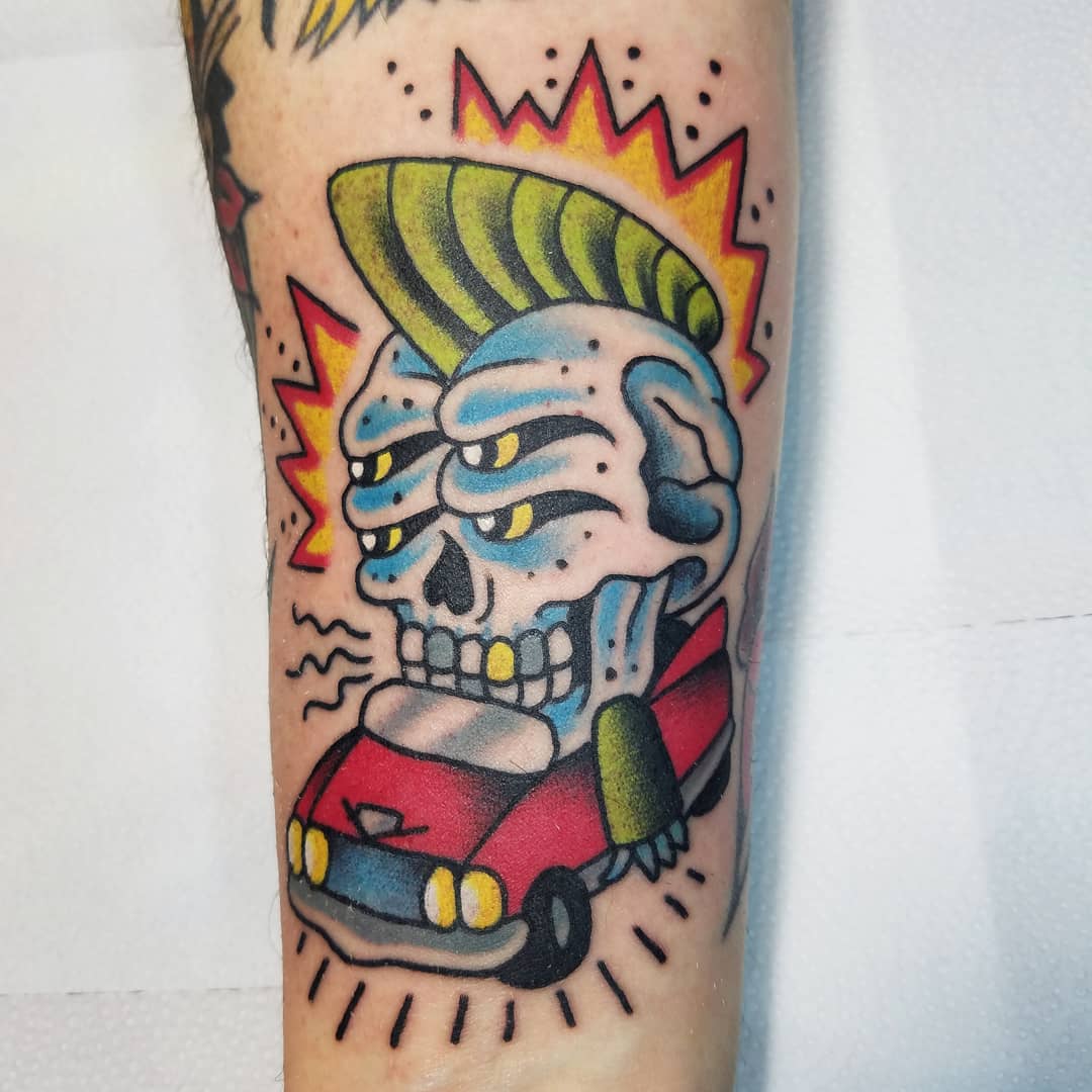 Sus influencias por fuera del tatuaje abarcan los comics y la ilustración relacionados con los dibujos animados y la música, en particular el género del rockabilly. “Desde que empecé a tatuar sentí que todo eso se podía fusionar con las bases del Tradicional Americano. Así que tomé ese rumbo”.