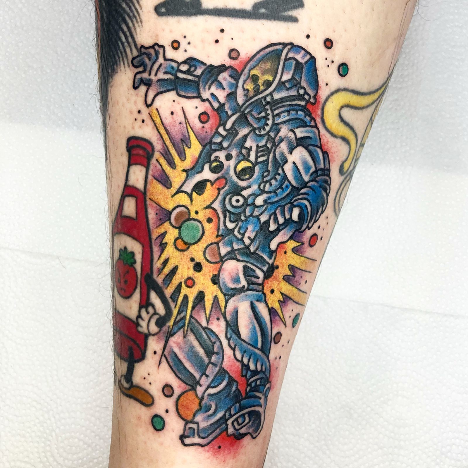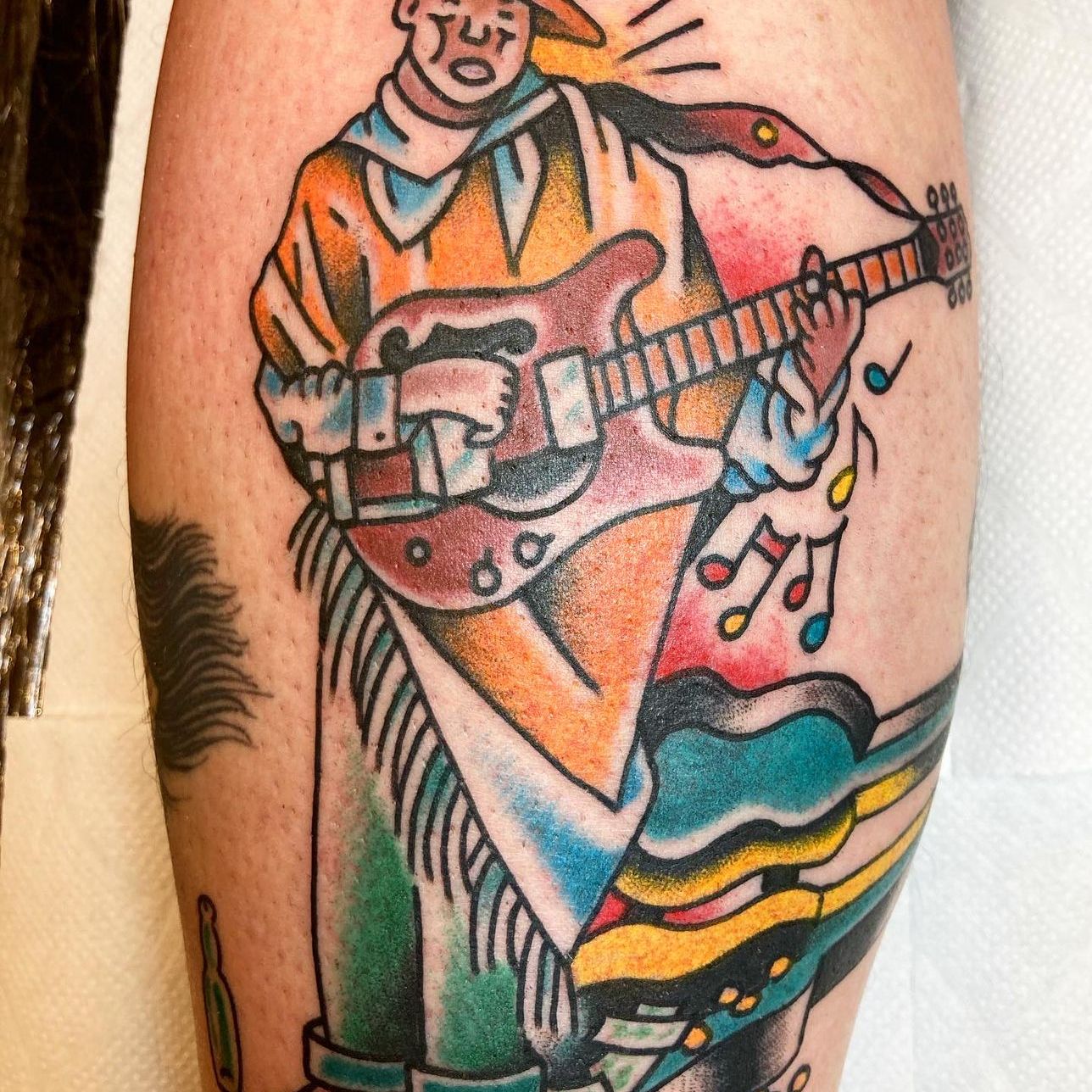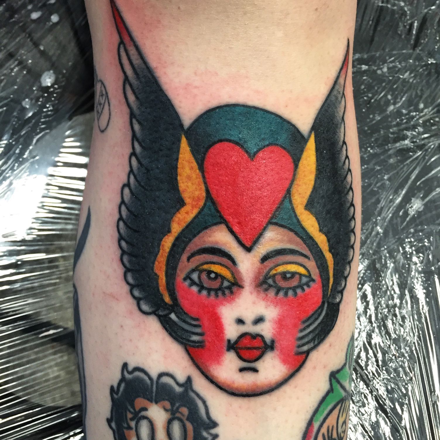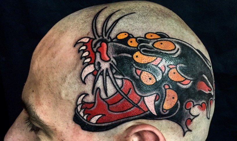 Su relación con el Tradicional empezó con una hoja de flashes de Sailor Jerry: “Me impactaba porque era muy decorativo, a pesar de que me decían que su estilo era viejo y ya no se hacía”. Pero su camino en el Tradicional iba por ese rumbo. Y se inspiró en un libro de Ed Hardy, Flash from the Past, que era una recopilación de flashes antiguos. “Me encantó. Y empecé a replicar esos diseños usando la misma paleta, colores, formas y línea… pero adaptándolos”.