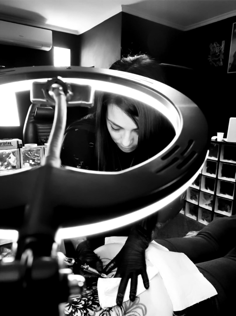 El proceso de transformación y evolución también aplica a su carrera, que comenzó cuando “no había muchas mujeres que se dedicaran a tatuar, lo cual también me marcó y me dio fuerza para no aflojar”. Así llegó a Amilkar Tattoo, el estudio en el que se sintió “como en casa”, y donde pudo desarrollar su objetivo de dedicarse solo a tatuar y seguir aprendiendo. Su status actual la encuentra tatuando en Posadas desde 2016. “Me mudé con mi pareja, Héctor Roa, también tatuador, pero de estilo Japonés. Aquí compartimos un hermoso estudio privado”.